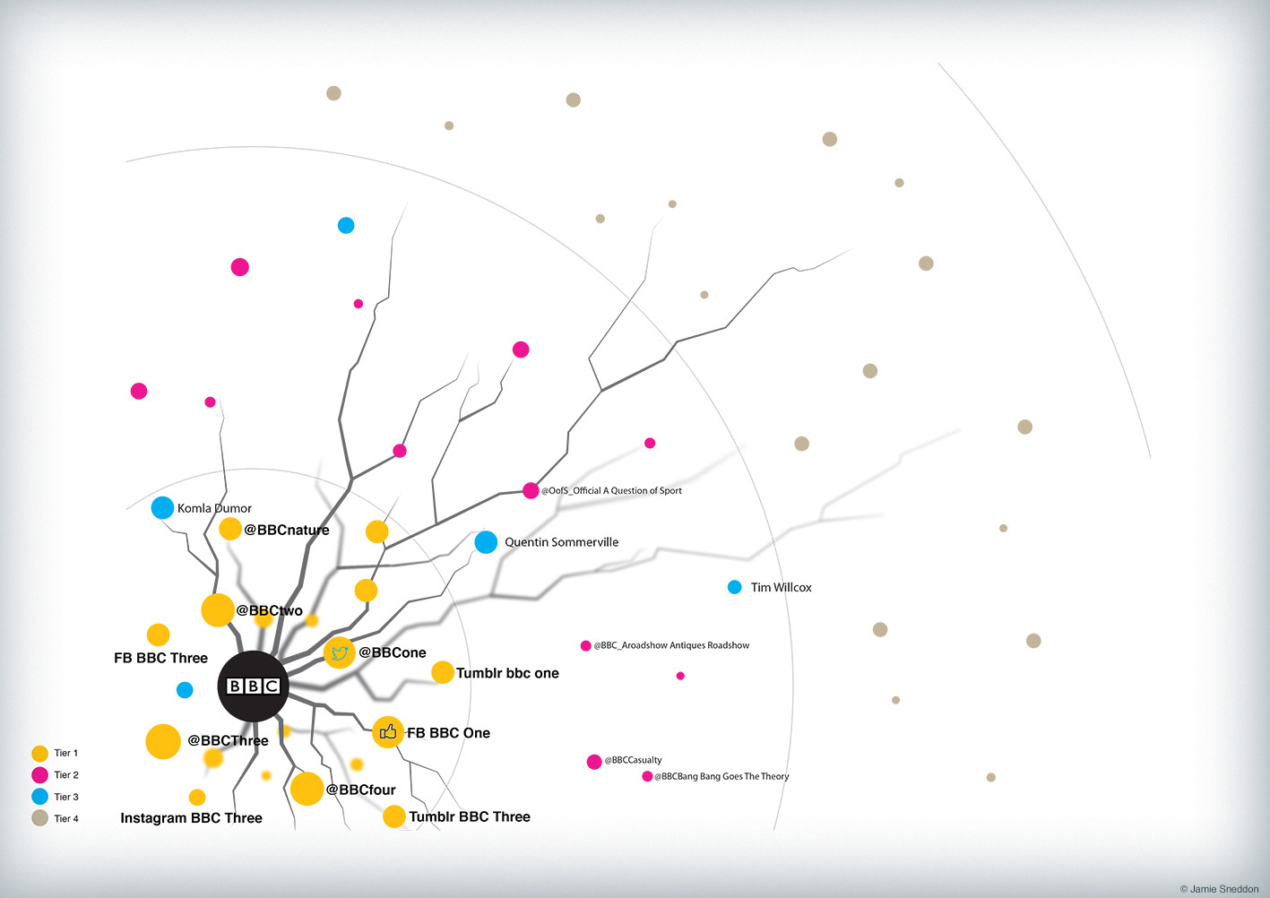 The concept we settled on displays each social media account as a ball floating around in a coloured liquid, with ripples filtering out from the high profile brands in the centre, around the BBC logo, to the smaller less know broadcasts towards the outer edge. It is noticeable that the lesser known broadcasts often have as large a social media presence as the more popular broadcasts [popularity is reflected by the ball size]..