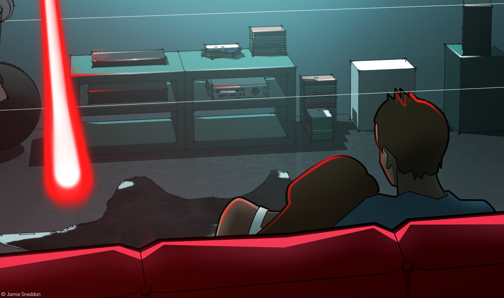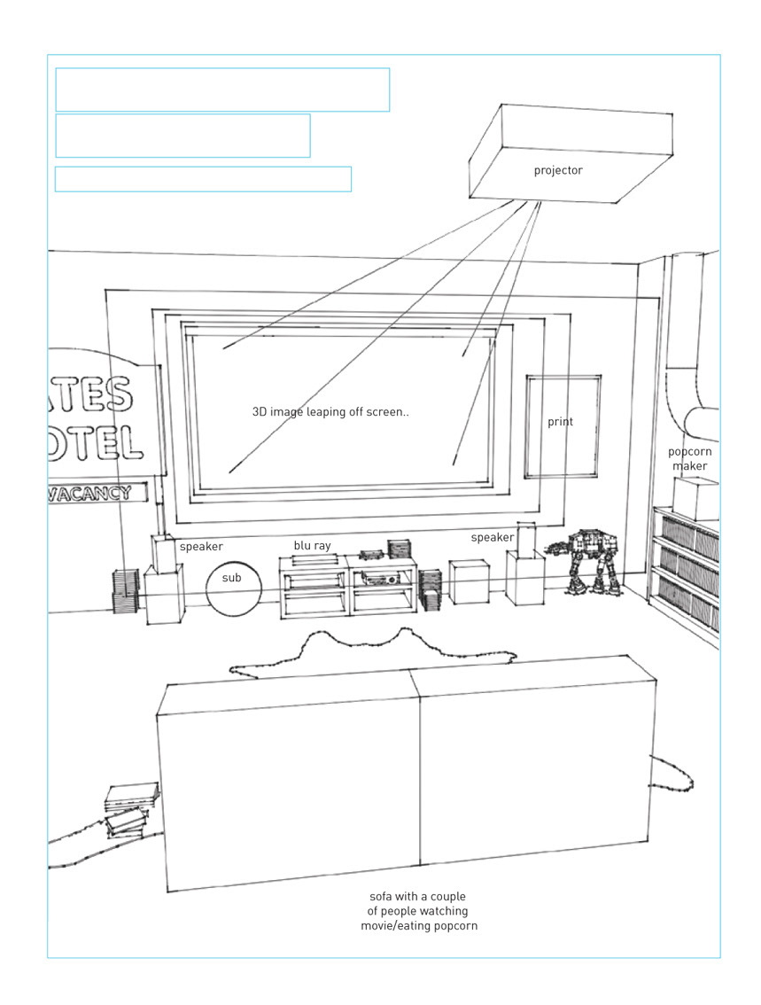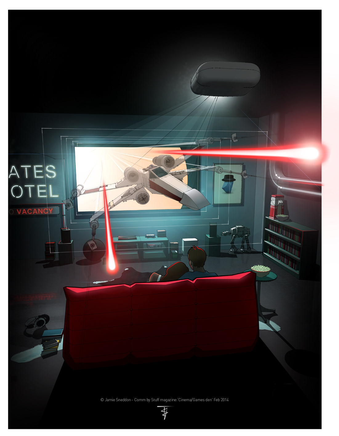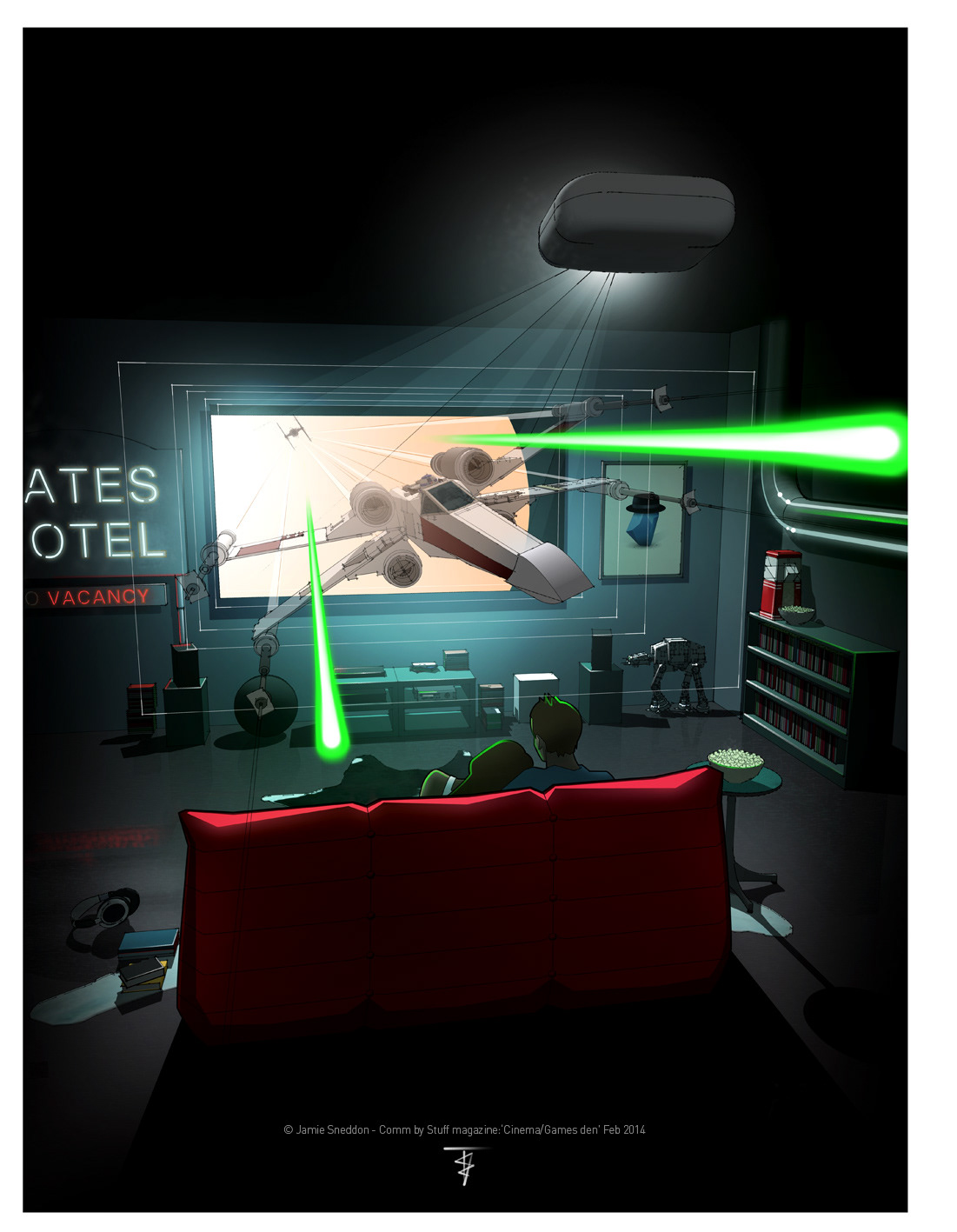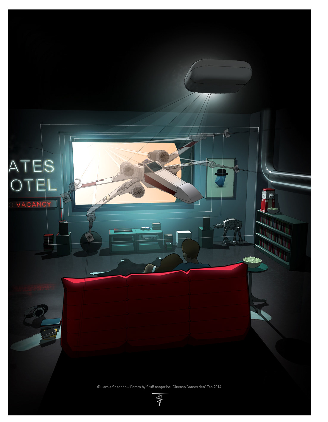 Comm by Stuff magazine: Home Cinema/Games Den - Feb 2014. The artwork features various pieces of tech for your den setup. See the next issue for more details..